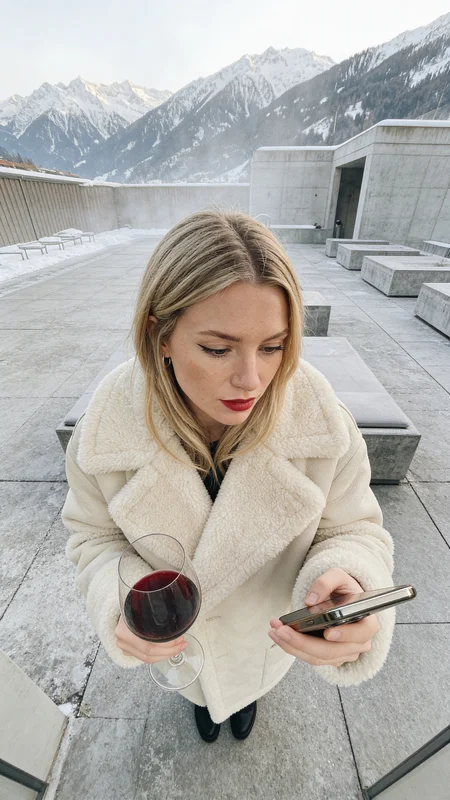 Content from premium ski destinations earns consistent above-average performance on Instagram because the location itself communicates aspiration before any subject or story is introduced. The wine-and-fur composition amplifies the luxury signal by adding two of the most universally recognised luxury objects — fine wine and natural fur — into the frame. Combined in a carousel format that walks the audience through the alpine moment across multiple frames, the result is the kind of content that lifestyle creators in the travel-luxury space use to mark seasonal transitions, announce alpine trips, or maintain a consistent upmarket visual identity without the cost and logistics of an actual ski resort trip.