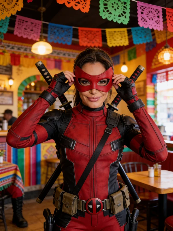 RAW photo a woman, close-up, adjusting red mask smirking playful, red and black Deadpool tactical suit with katanas crossed back (fully covered), utility pouches belt, boots, mischievous gaze into camera, Mexican cantina colorful papel picado, Canon EOS R5, 85mm, f/1.8, ISO 400, 1/250s, warm practical lights + vibrant colors, merc with mouth, candid.
