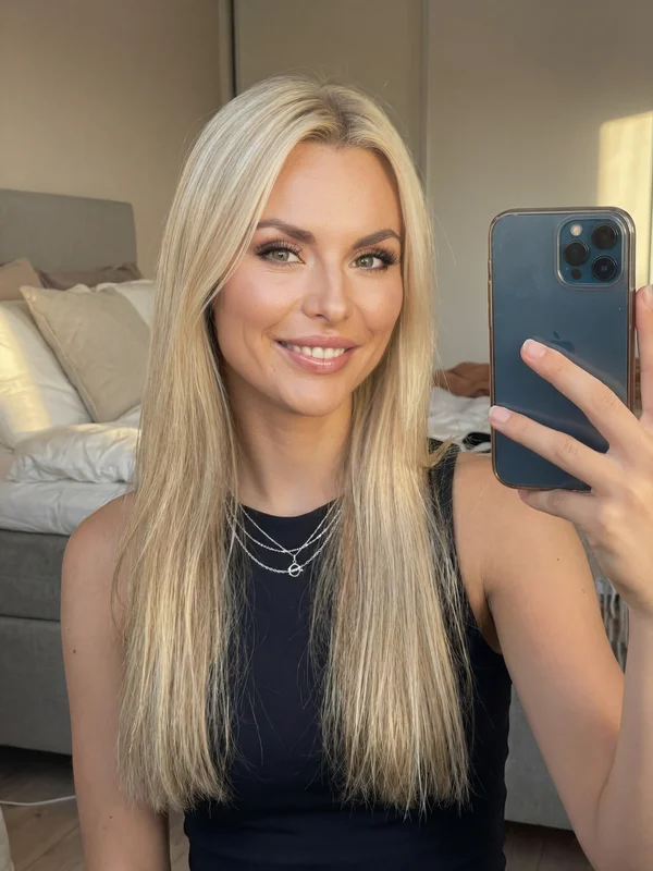 The selfie is the most widely produced photographic format in the world, yet most AI generators produce selfies that immediately read as artificial: the arm angle is wrong, the framing is too composed, or the expression is too rigid. This template is built specifically to avoid those tells. The pre-built prompt specifies the characteristic slight upward camera angle of a genuine arm-extended selfie, the natural soft focus that comes from a phone camera at close range, and an expression that communicates ease rather than pose. The blonde subject provides a specific hair colour and texture reference that the scene lighting — warm, ambient, flattering — is calibrated to render correctly. Your face replaces the subject's with matched lighting so the swap integrates naturally into the selfie format without producing the over-sharpened face on soft background mismatch that affects many AI face swap tools.