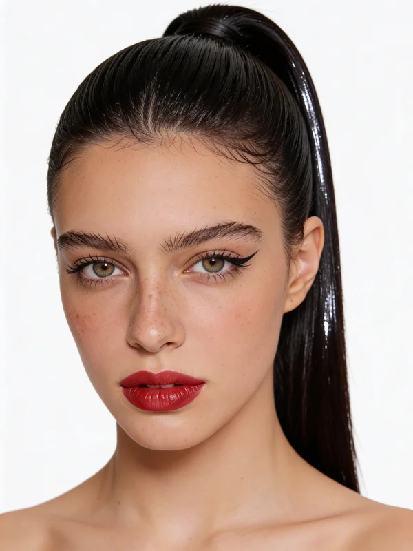 Portrait of a normal 22-year-old Eastern European girl, professional bold classic makeup, perfect even skin with matte foundation, sharp subtle contour, arched defined eyebrows, winged cat-eye eyeliner, long separated lashes, classic red matte or satin lips with crisp edges, slight highlight on cupid's bow, polished glamorous look, sleek straight blowout hairstyle pulled into high glossy ponytail, super smooth hair with mirror shine, tight perfect hairline, professional even frontal lighting, no dramatic shadows covering features, full clear view of face and hair, minimalist white background, photorealistic high-fashion beauty shot, 85mm lens, f/2.0, ultra detailed lips texture and hair gloss, 8k --ar 2:3 --v 6 --stylize 700 --no natural lips, glossy lips, loose hair, waves, curls, dewy skin, smokey eyes, pink lips, undone look