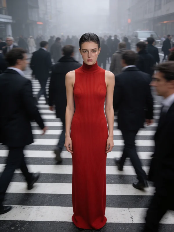 cinematic fashion editorial photograph, stunning tall model standing perfectly still in the center of a busy zebra crossing, wearing elegant sleeveless high-neck long red ribbed knit maxi dress, sharp focus on her poised elegant face and body, intense direct gaze at camera, slicked-back hair, surrounded by heavily motion-blurred crowd of people in dark suits and coats rushing past in all directions, strong sense of isolation and contrast, dynamic panning effect, blurred urban pedestrians creating ghostly streaks, moody overcast city lighting, cool gray tones with vibrant red pop, high contrast, shallow depth of field, photorealistic ultra-detailed 8K, dramatic atmospheric haze, high fashion minimalist mood, street style editorial, shot on 35mm film, cinematic composition from slightly low angle --ar 2:3 --stylize 350 --v 6 --q 2