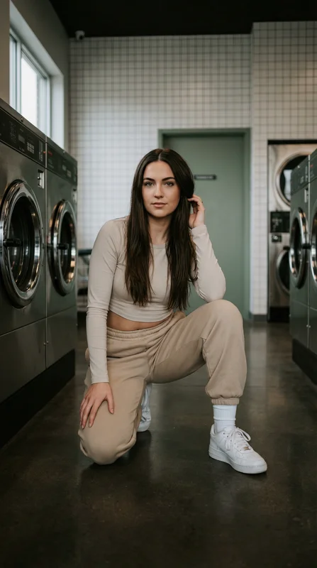 Lifestyle and fashion content creators, streetwear and casual clothing brands, authenticity-focused social media managers, and any creator who wants the casual, unglamorous intimacy of the laundromat aesthetic for portrait content that signals relatability and effortless confidence.