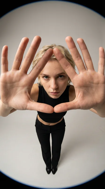 The through-the-hands fisheye portrait is one of the few portrait compositions that communicates a concept rather than just a subject — making it ideal for AI image content that needs to stand out from conventional portrait generation.