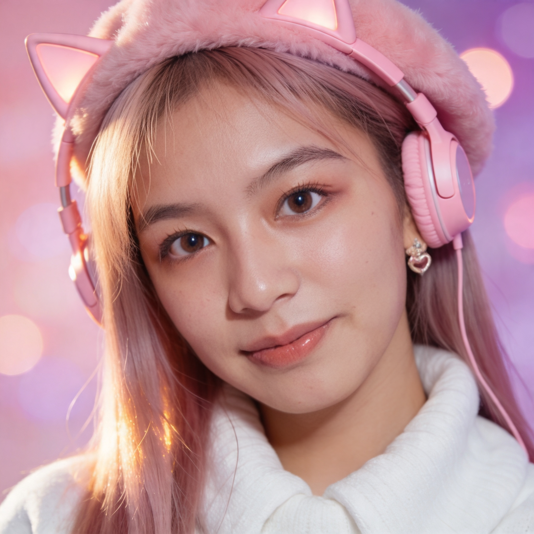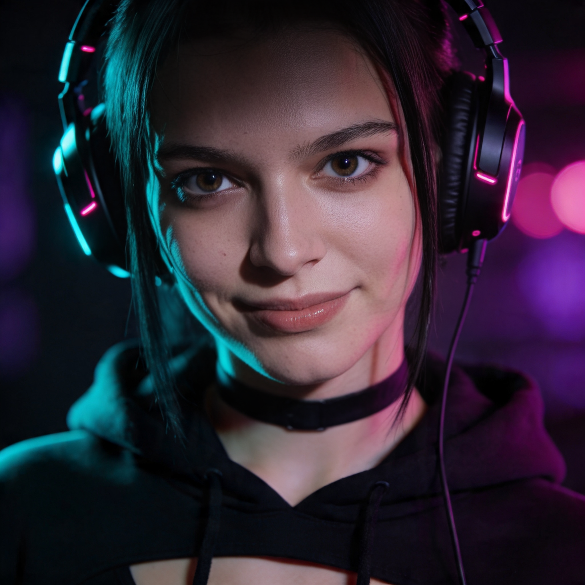 Each character needs a webcam-style headshot — this is the photo that Lipsync will animate. It should look like a real webcam feed: upper body, casual outfit, over-ear headphones on or around neck, slightly warm room lighting from a monitor glow behind. NOT a professional photo shoot — a real girl sitting in front of her PC.