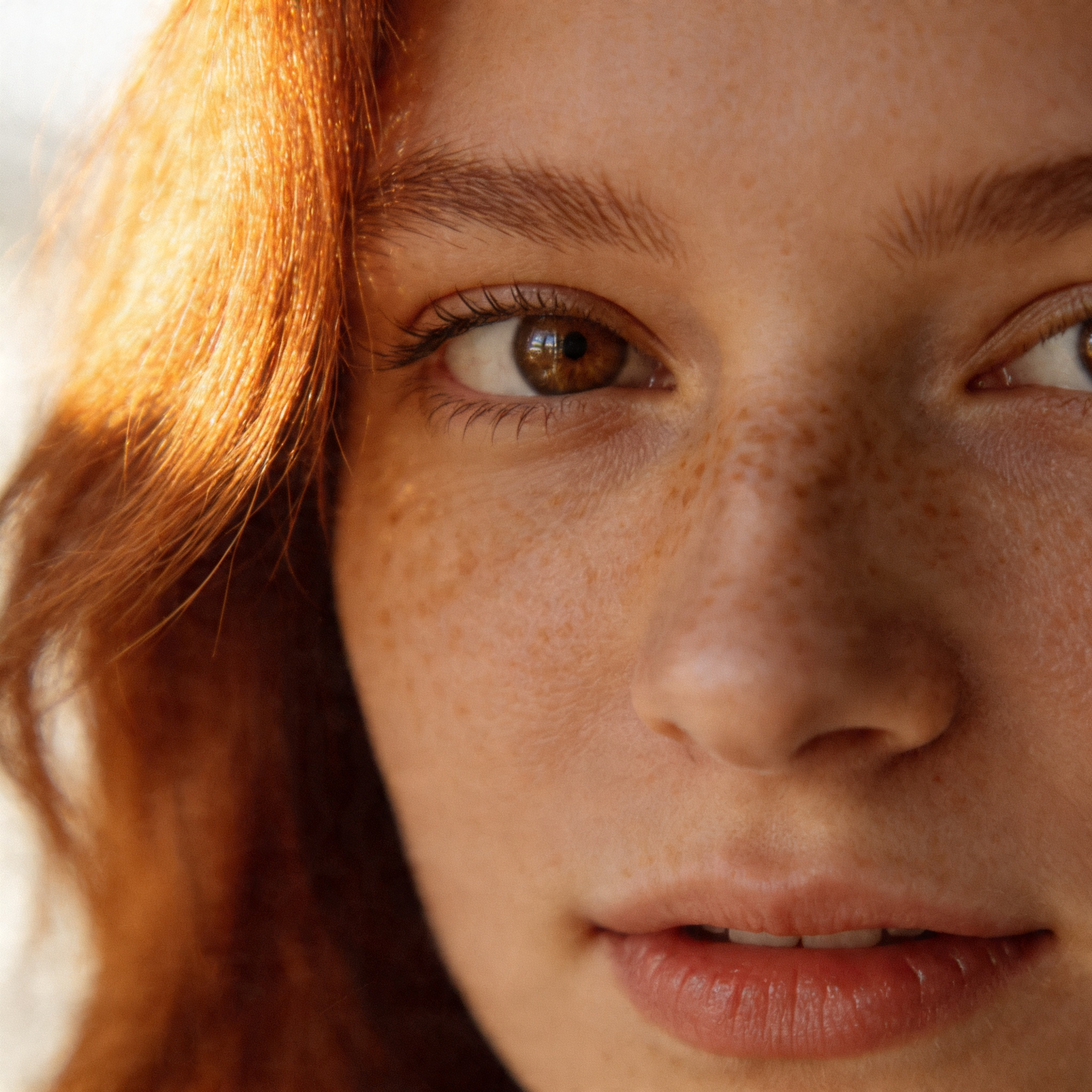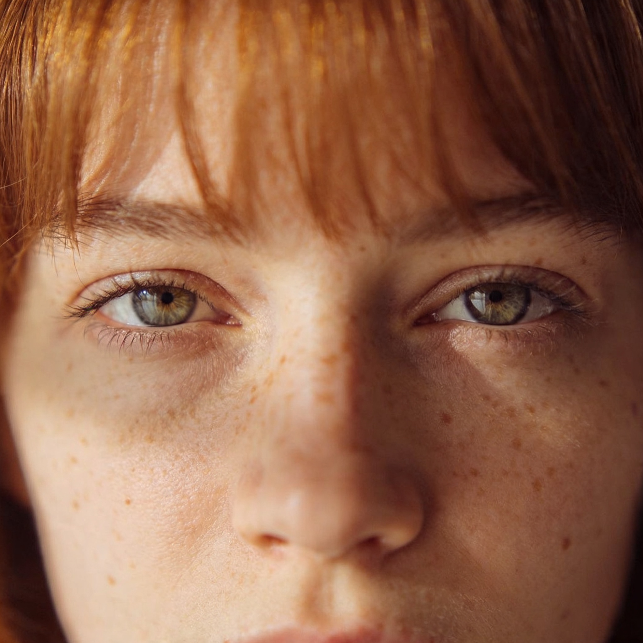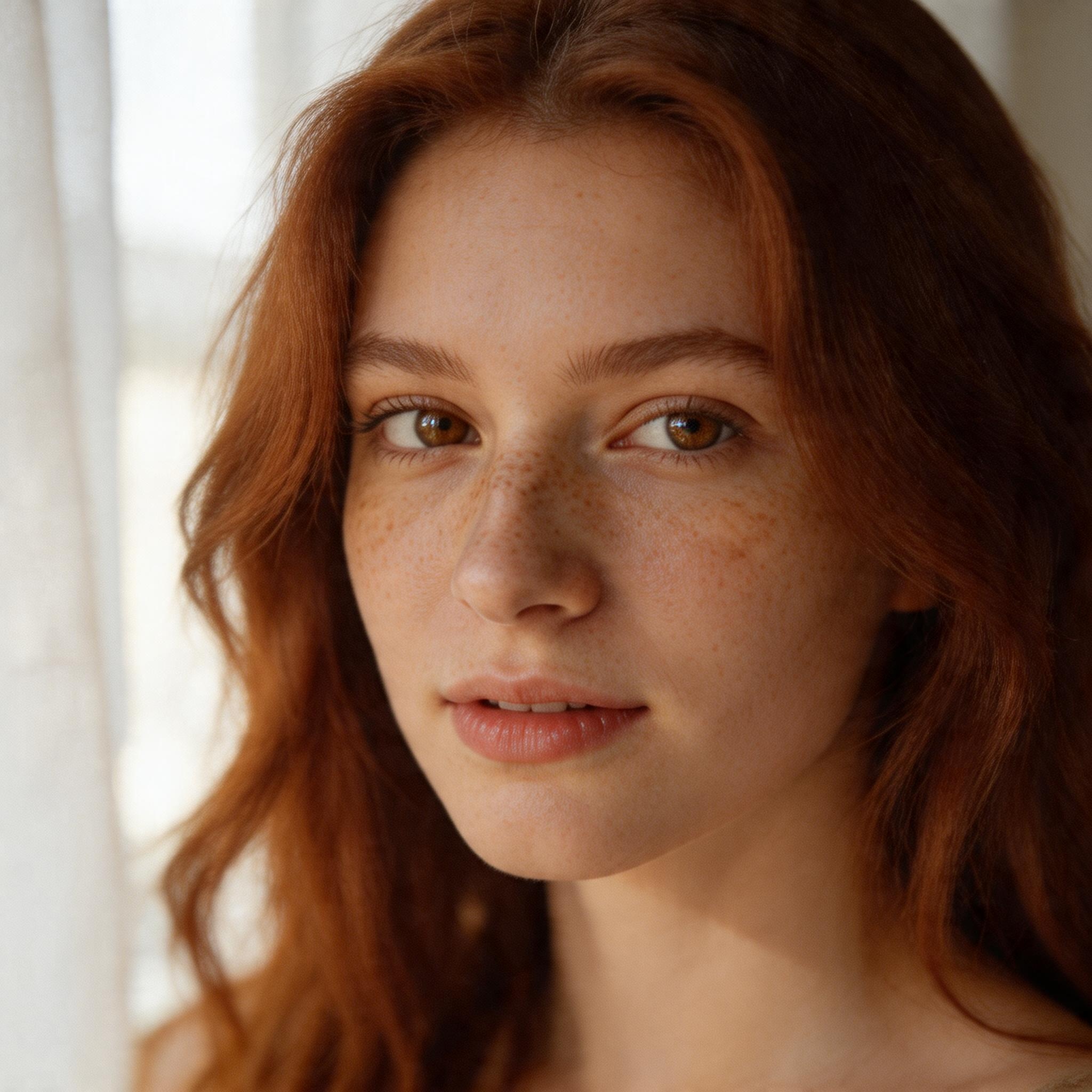 Close-up portrait of a woman with freckles and auburn hair, soft natural
