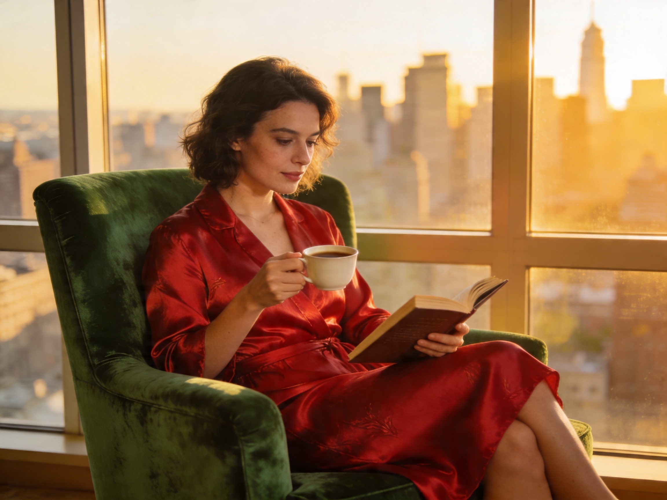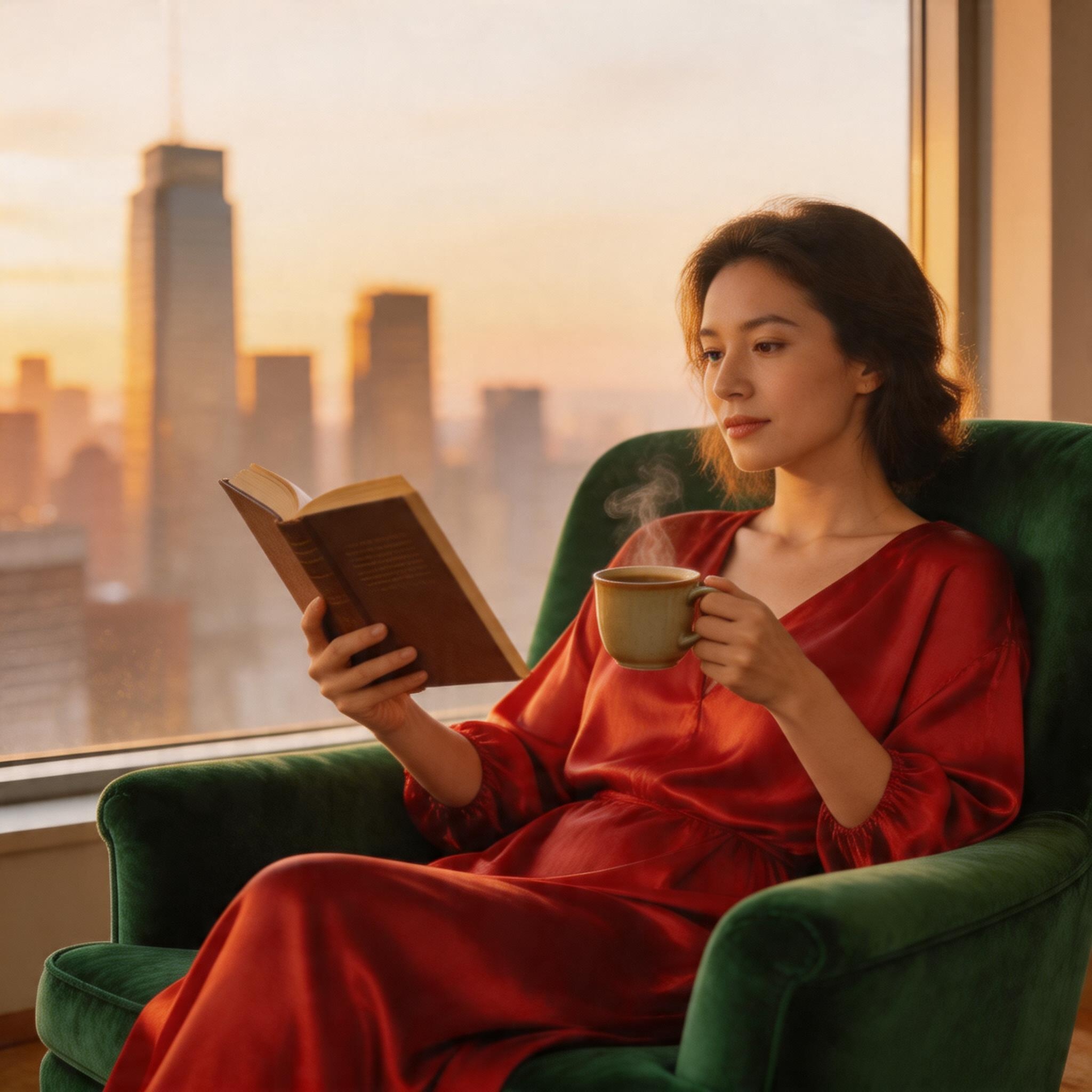 A woman in a red silk dress sitting on a velvet green chair, holding a cup