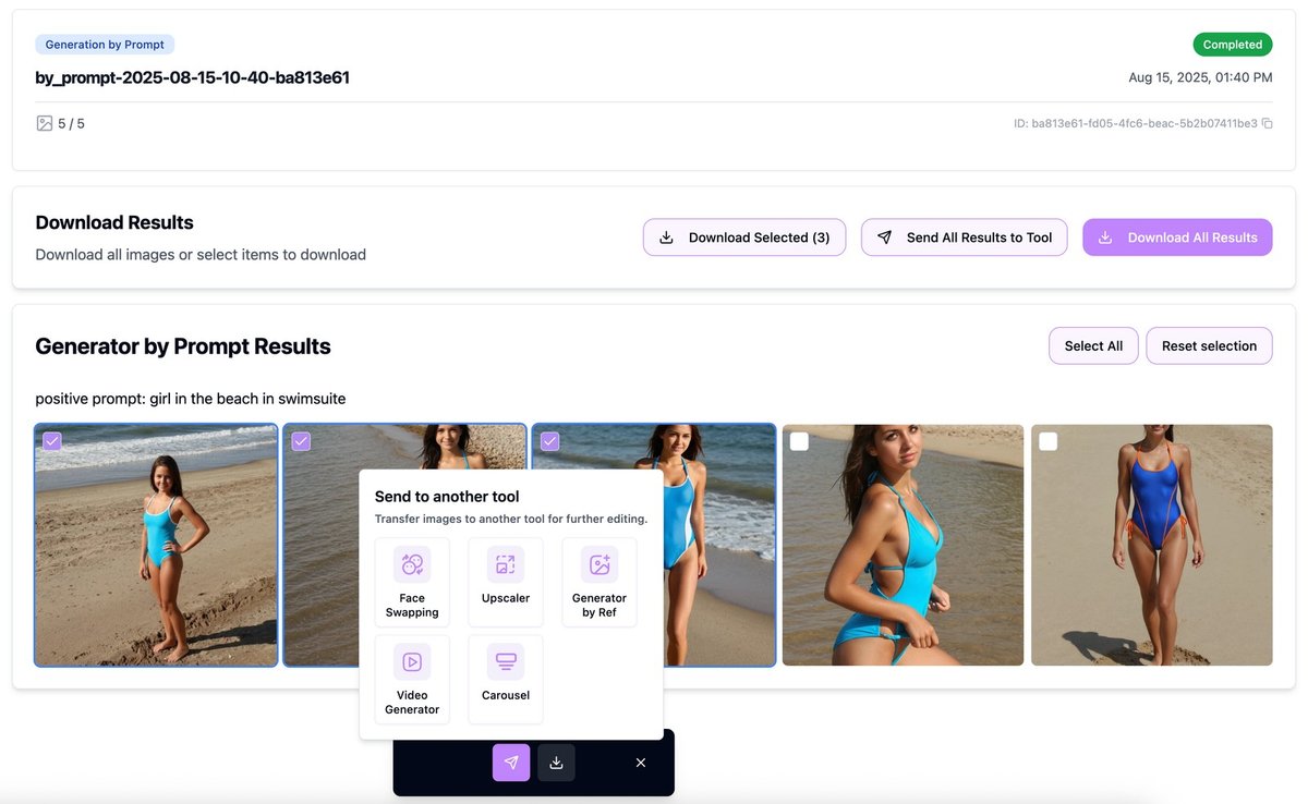 - Open the finished task, review, Download or Send to another tool (Upscaler, Face Swap, Generator by Ref, Video, Carousel).