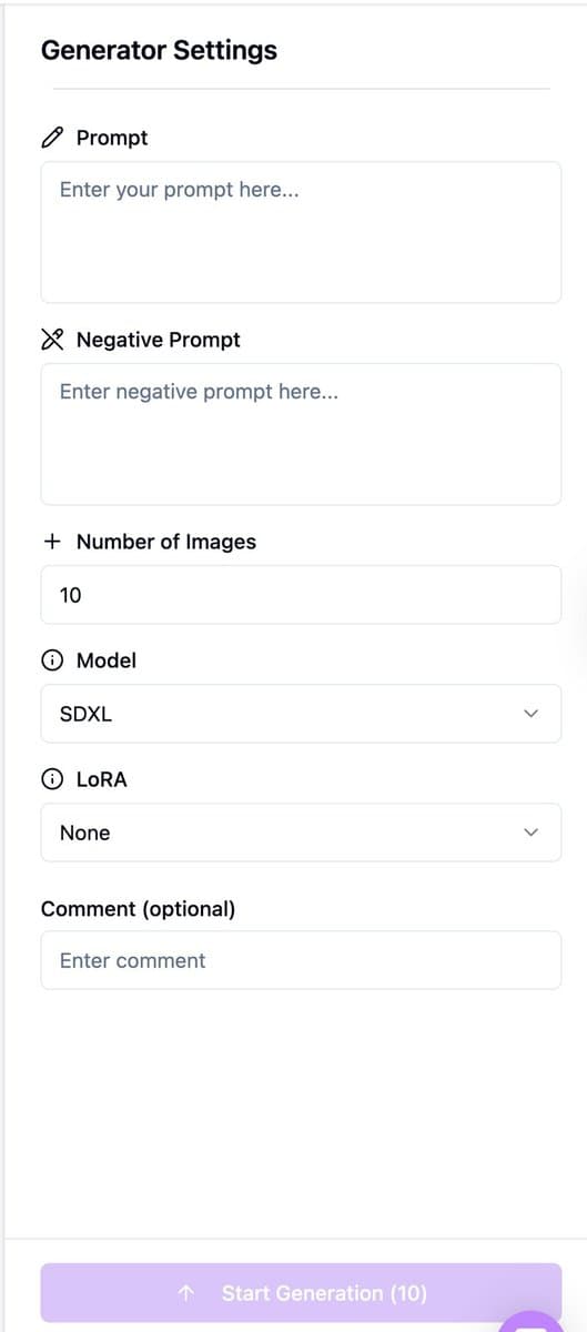 - LoRA — SDXL only. Pick up to 3 LoRAs and set Strength for each (default 0.8, range 0.1–3.0).