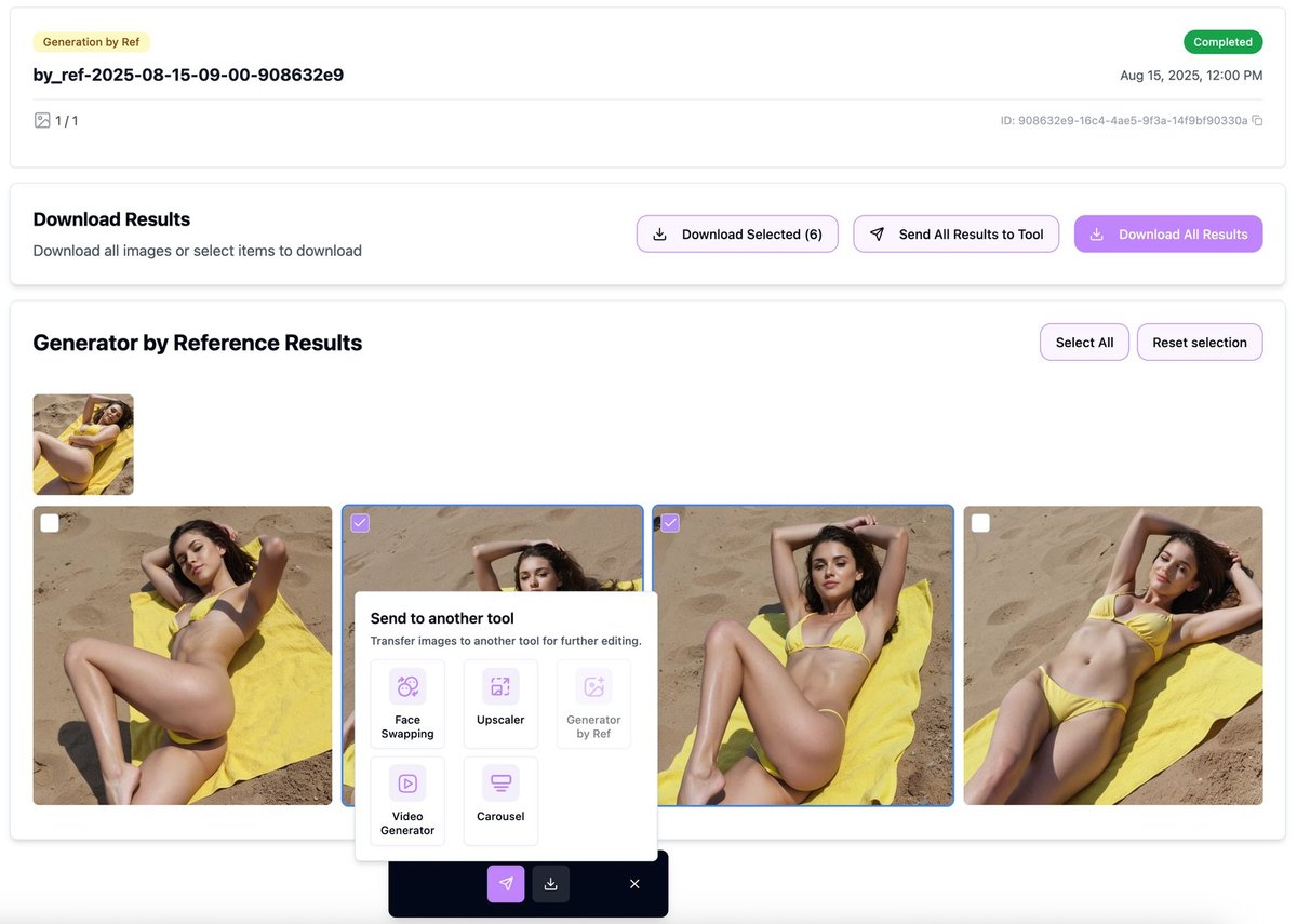 - Send to another tool to continue the pipeline (Upscaler, Face Swapping, Generator by Ref, Video Generator, Carousel).