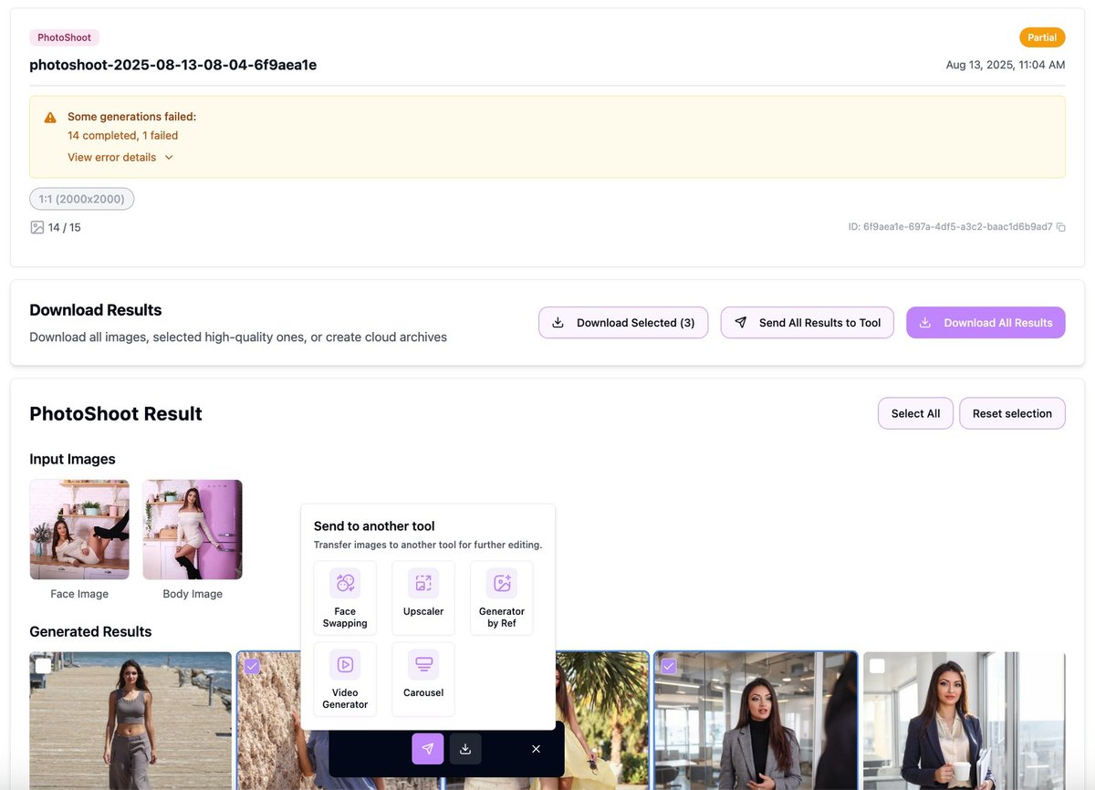 - Open the task, select keepers, then Download or Send to another tool (Upscaler, Face Swap, Generator by Ref, Video, Carousel).