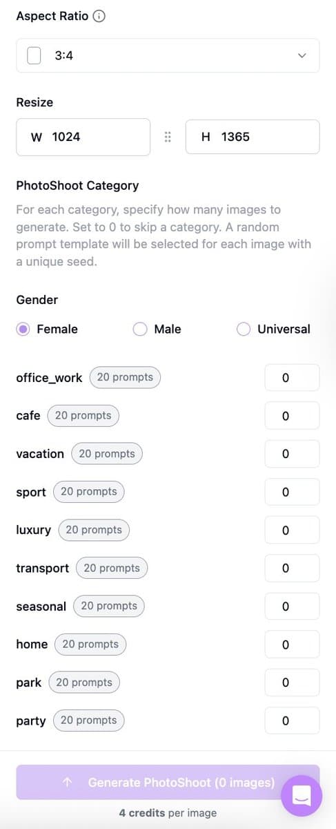 - PhotoShoot Category Toggle Female / Male / Universal, then enter how many images to generate per category (e.g., Office – 6, Café – 4). The button will show the total count.